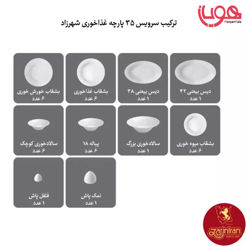 یکی از برندهای معروف و معتبر در زمینه تولید چینی و ظروف سرامیکی است. این برند به خاطر طراحیهای زیبا، کیفیت بالا و craftsmanship دقیق شناخته میشود. محصولات چینی زرین معمولاً شامل ظروف غذاخوری، دکوری و سرویسهای مختلف هستند که با استفاده از بهترین مواد اولیه ساخته میشوند.قالب ایتالیا اف به صورت سرویس های چینی 12 نفره کامل (102 پارچه)، سرویس های 6 نفره غذاخوری (28 پارچه)، سرویس 6 نفره چای خوری کامل (17 پارچه)، سرویس 6 نفره چای خوری (12پارچه)، سرویس 6 نفره قهوه خوری (12 پارچه)، سرویس 13پارچه پیاله و سرویس 9 پارچه انارخوری تولید و به فروش می روند. به دلیل مقاومت بالایی ظروف چینی زرین، امکان استفاده از چینی در مایکروفر وجود دارد. همچتین در صورت شستشو در ماشین ظرفشویی، به دلیل تولید به روش دکور داخل لعابی، از کیفیت رنگ های آن کاسته نخواهد شد و رنگها در تماس مستقیم با مواد غذایی نیستند. همچنین چینی زرین به دلیل استاندارهای بالایی که در تولید محصولات خود دارد، کلیه چینی ها را مطابق با استاندارهای بهداشتی FDA تولید می کند و کلیه چینی ها 100% بهداشتی تولید شده اند.شما با استفاده از ظروف موجود در بسته بندی این محصول می توانید یک میز شام بسیار شیک برای 6 نفر چیده و از آن ها به بهترین شکل پذیرایی کنید.