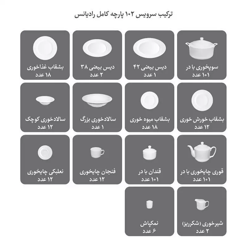 سرویس چینی زرین مدل رادیانس کلودیا طلایی – ۱۲ نفره، ۱۰۲ پارچه