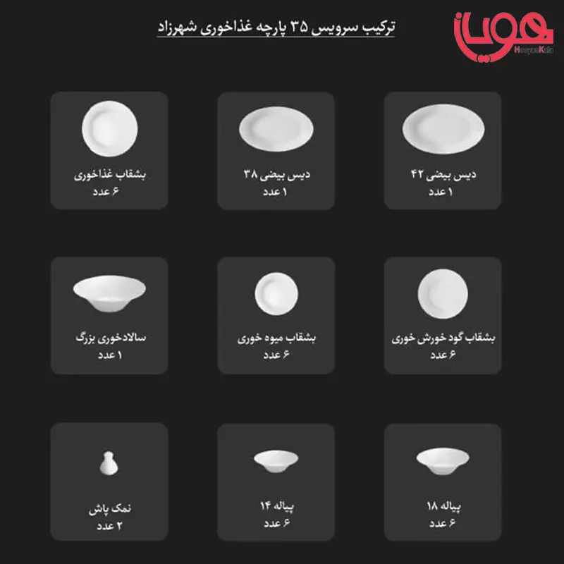 چینی 35 پارچه به سرویس های غذاخوری سری شهرزاد چینی زرین اطلاق می شود. این سرویس های غذاخوری در طرح ها، رنگ ها و درجات مختلفی تولید می شود. سرویس غذاخوری 35 شهرزاد برای پذیرایی از 6 نفر طراحی شده است و شامل ظروف ضروری برای سرو غذا می شود، در این سرویس ها بر خلاف سرویس های چینی کامل، اقلامی مانند سرویس چای خوری و سوپخوری دیده نمی شود. البته در میان سرویس های 6 نفره چینی زرین سری شهرزاد از تعداد اقلام بیشتری برخوردار است.