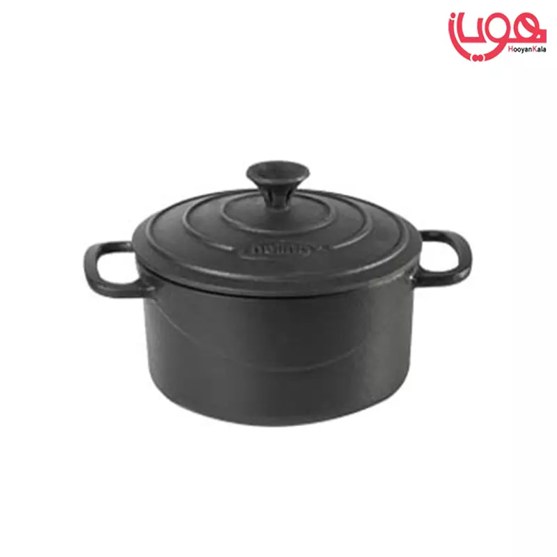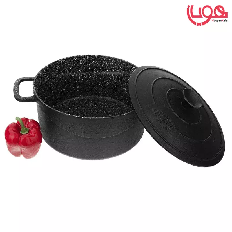 1. جنس چدن : این قابلمه از جنس چدن ساخته شده که باعث می‌شود حرارت را به خوبی توزیع کند و غذاها به طور یکنواخت پخته شوند.