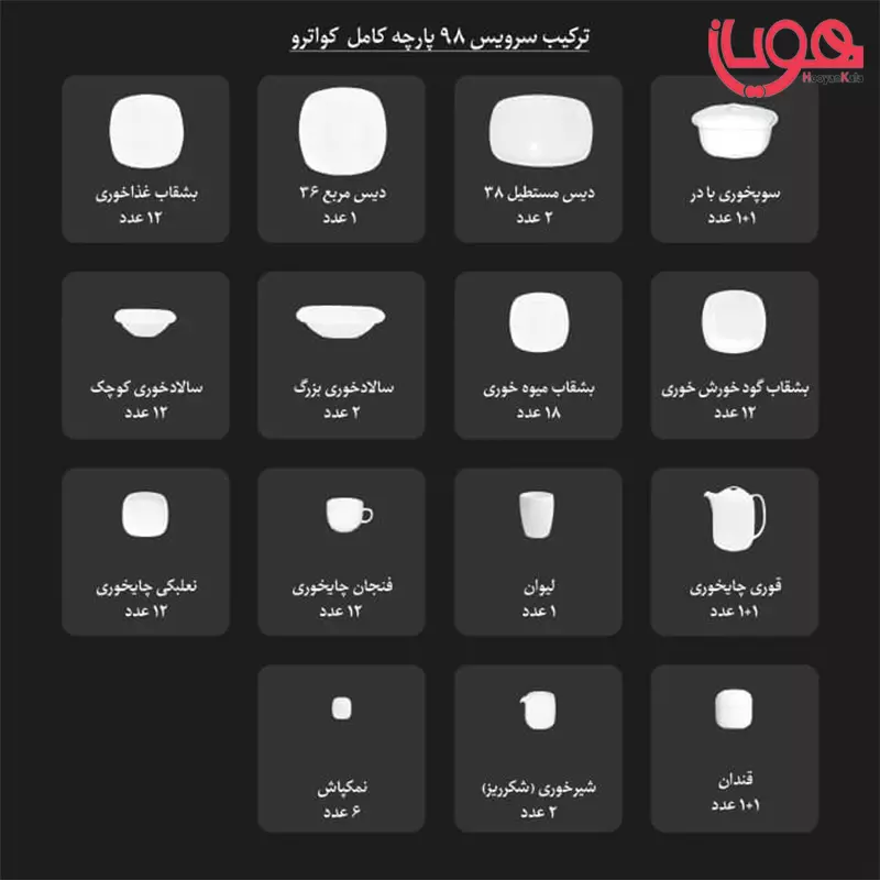 1. تعداد پارچه: ۹۸ پارچه کامل مناسب پذیرایی از ۱۲ نفر