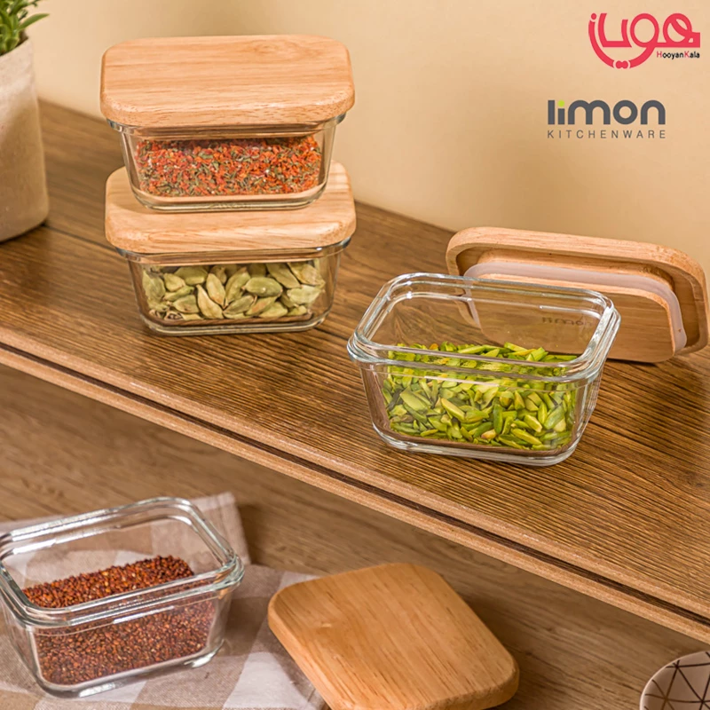 شرکت بزرگ لیمون ظروفی با جنس بدنه آکرولیک و شیشه و درب چوبی با جنس چوب راش تولید کرده است که نشکن میباشد و طول عمر بالا و کاربردی دارد.این ظروف چوبی و درب چوبی در سایز بندی مختلف تولید شده است و از شیشه ی آکرولیک ضد خش و شیشه ی معمولی میباشد.